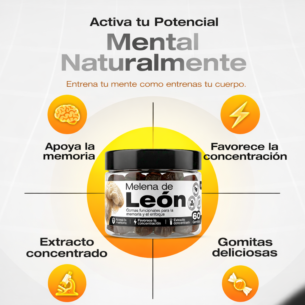 ¿Sientes que tu mente no rinde al 100%? La niebla mental, la falta de concentración y el cansancio cognitivo son más comunes de lo que crees. Nuestras gomas de Melena de León con Cúrcuma y Pimienta Negra están formuladas con ingredientes naturales para ayudarte a recuperar la claridad mental que necesitas, sin estimulantes, sin azúcar y sin complicaciones.